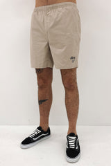 The Stussy Basic Stock Beachshort in Cement are a men's elasticated waist short with grown-on waistband with internal draw cord. Featuring front in-seam pockets and screen printed logo on left leg. Constructed from a 100% cotton.