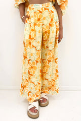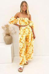The Cleo Set features a vibrant summery pattern. The top features an elastic shirred front and off the shoulder ruched sleeves, cropped length and zipper on the back. The pants have an elasticated waistband at the back, side pockets, and pleated detail for both comfort and style.