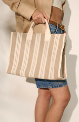 This large-sized beach tote features a charming stripy canvas exterior with handle.