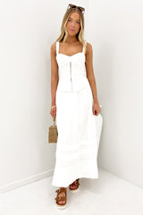 Stay effortlessly stylish and comfortable with our Harkin Set. Featuring elastic ruched sleeve straps, a tie detail at the bust, and a hook and eye closure, this top offers a secure and flattering fit. The matching skirt is lined and has an invisible zipper and tiered detail for added charm. Perfect for any occasion.