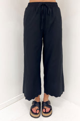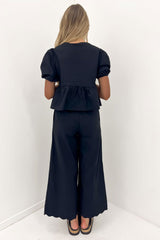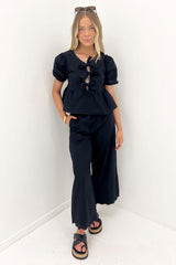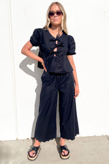 The Tessa Set features a top with a round neckline with ties at the bust, and short elastic-cuffed sleeves. The pants feature an elastic waistband with drawcord, side pockets and a scolloped hem that provides functionality and style.